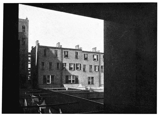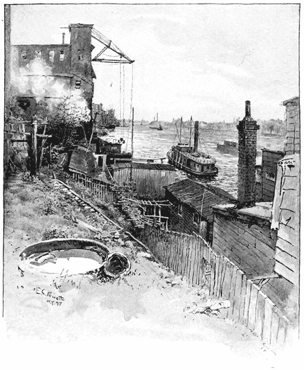 The comfortable country houses along the shore, half-way up the island, first become uncomfortable city houses; then tenements, warehouses, sometimes hospitals, even police stations, before they are finally hustled out of existence to make room for a foul-smelling gas-house or another big brewery. Many of them are still standing, or tumbling down; pathetic old things they are, with incongruous cupolas and dusty fanlights and, on the river side, an occasional bit of old-fashioned garden, with a bunker which was formerly a terrace, and the dirty remains of a summer-house where children once had a good time—and still do have, different-looking children, who love the nearby water just as much and are drowned in it more numerously. It is not only by way of the recreation piers that these children and their parents enjoy the water. It is a deep-rooted instinct in human nature to walk out to the end of a dock and sit down and gaze; and hundreds of them do so every day in summer, up along here. Now and then, through these vistas you get a good view of beautiful Blackwell's Island and its prison and hospital and poorhouse buildings. Those who see it oftenest do not consider it beautiful. They always speak of it as "The Island."