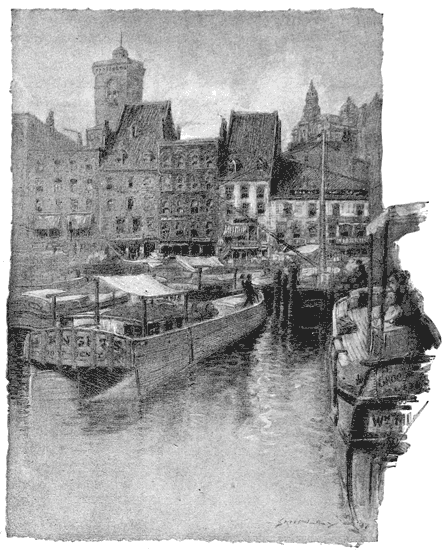 For instance, down there by the starting-point. If you go up toward the bridge from South Ferry a block or so and pull down your hat-brim far enough to hide the tower of the Produce Exchange, you have a bit of old New Amsterdam, just as it has been for years, so old and so Amsterdamish, with its long, sloping roofs, gable windows, and even wooden-shoe-like canal-boats, that you may easily feel that you are in Holland, if you like. As a matter of fact, it is more like Hamburg, I am told, but either will do if you get an added enjoyment out of things by noting their similarity to something else and appreciate mountains and sunsets more by quoting some other person's sensations about other sunsets and mountains. 389