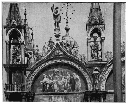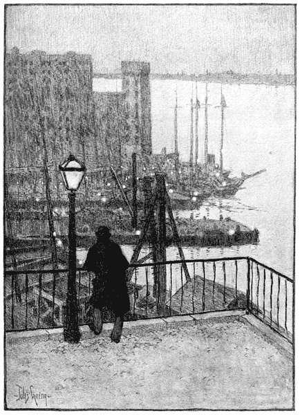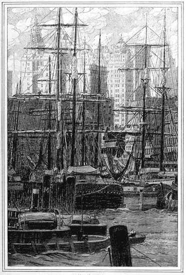 But if you believe that there is also an inherent, characteristic beauty in the material manifestations of the spirit of our own new, vigorous, fearless republic—and whether you do or not, if you care to look at one of these sudden contrasts referred to—not a stone's throw farther up the water-front there is a notable sight of newest New York. This, too, is good to look at. Behind a foreground of tall masts with their square rigging and mystery (symbols of the world's commerce, if you wish), looms up a wondrous bit of the towering white city of 1900, a cluster of modern high buildings which, notwithstanding the perspective of a dozen blocks, 392 are still high, enormously, alarmingly high—symbols of modern capital, perhaps, and its far-reaching possibilities, or they may remind you, in their massive grouping, of a cluster of mountains, with their bright peaks glistening in the sun far above the dark shadows of the valleys in which the streams of business flow, down to the wharves and so out over the world.