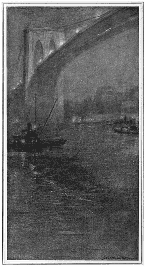 That scene is spectacular. There is another from the water that is dramatic. Possibly the pilots on the Fall River steamers become hardened, but to most of us there is an exciting delight in creeping up under that great bridge of ours and dramatically slipping through without having it fall down this time; and then looking rather boastfully back at it, swooping silently, confidently across from one city to the other, as graceful and lean and characteristically American in its line as our cup defenders, and as overwhelmingly powerful and fearless as Niagara Falls. However, much like the Thames embankment is the bit of East Fifty-ninth Street in a yellow fog, and however skilful you may be in making an occasional acre of the Bronx resemble the upper Seine, this big bridge of ours cannot very well remind anyone of anything abroad, because there aren't any others.