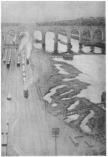 But over on the east edge of the town there is more to look at and more of a variety. All the way from the Bridge and the big white battle-ships squatting in the Navy Yard across the river; up past Kip's Bay with its dapper steam-yachts waiting to take their owners home from business; past Bellevue Hospital and its Morgue, and the antediluvian-looking United States Frigate New Hampshire moored nearby, (now used by the Naval Reserve), past Thirty-fourth Street ferry with its streams of funerals and fishing-parties; Blackwell's Island with its green grass and the young doctors and officials upon it, playing tennis obliviously; Hell Gate with its boiling tide, where so many are drowned every year; East River Park with its bit of green turf (it is too bad there are not more of these parks on our water-fronts); past Ward's Island with its public institutions; Randall's Island with more public institutions—and so up into the Harlem where soon around the bend the occasional tall mast looks very incongruous as seen across a stretch of real estate.