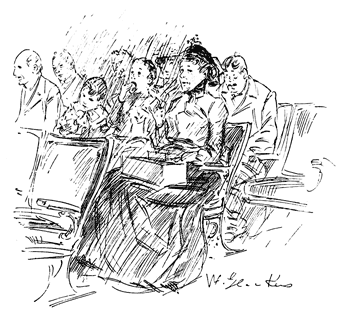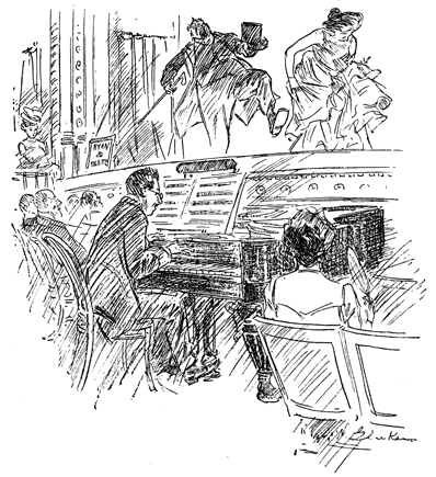 The sky-line and its constant change can be watched to best advantage from the point of view of the Jersey commuter on the ferry; he also has some wonderful coloring to look at and some uncommon, weird effects, such as that of a late autumn afternoon (when he has missed the 5.16 and has to go out on the 6.26) and it is already quite dark, but the city is still at work and the towering office-buildings are lighted—are brilliant indeed with many perfectly even rows of light dots. The dark plays tricks with the distance, and the water is black and snaky and smells of the night. All sorts of strange flares of light and puffs of shadow come from somewhere, and altogether the commuter, if he were not so accustomed to the scene, ought not to mind being late for dinner. However, the commuter is used to this, too.