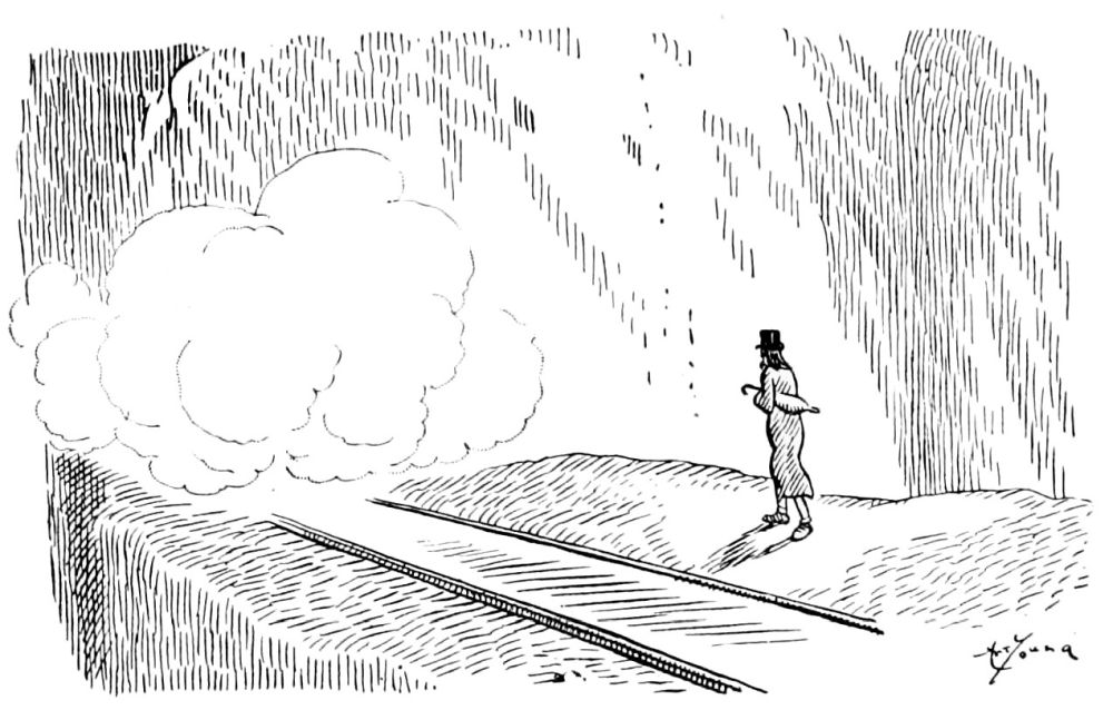 An irresistible impulse prompts him to walk to the rear platform of the car. A sudden lurch of the train as it turns round a curve in the track and he finds himself lying prone by the road side.