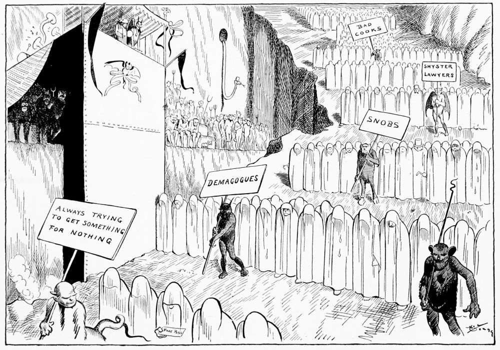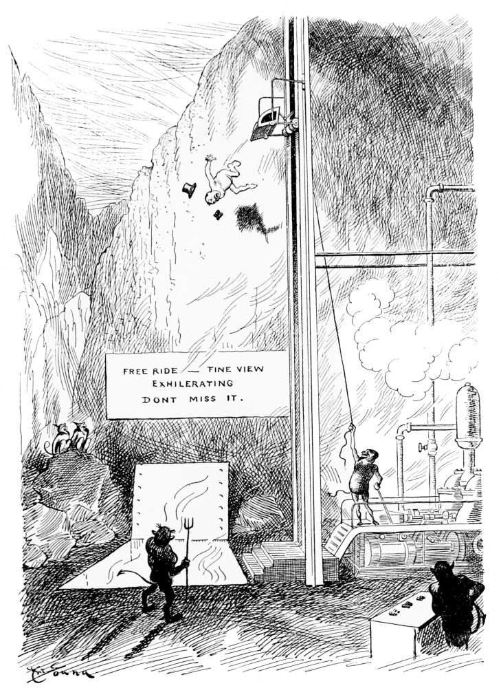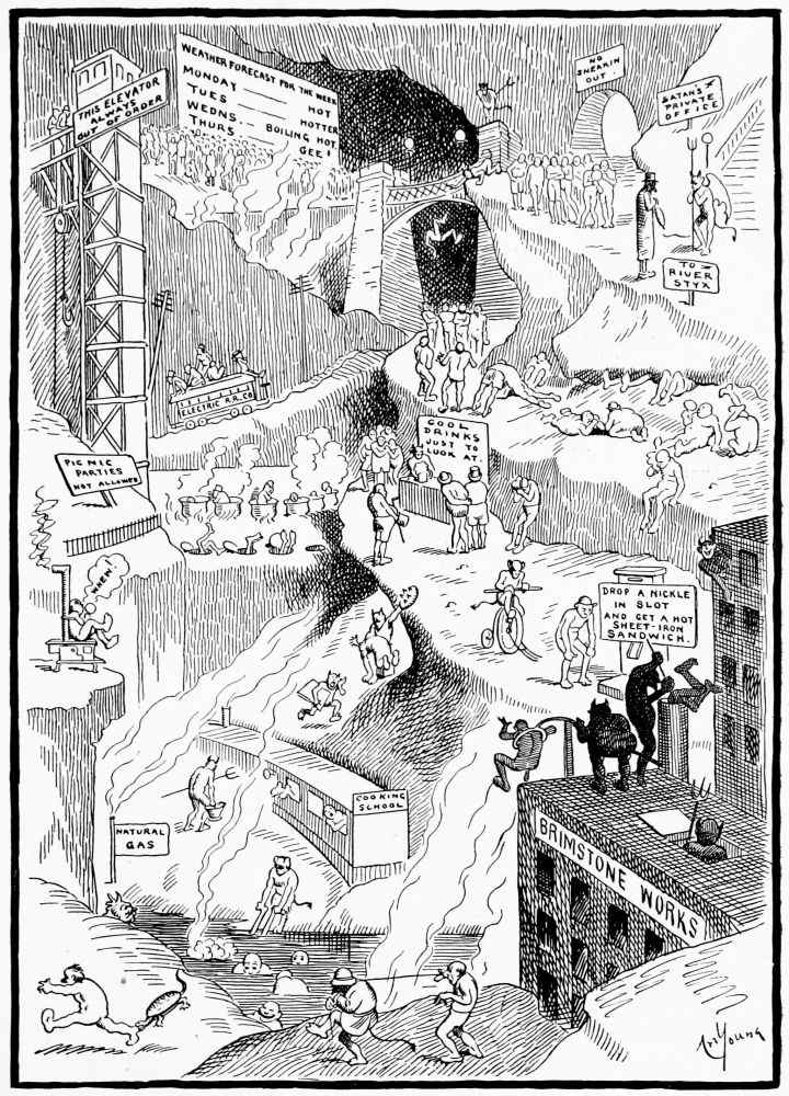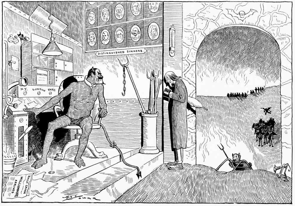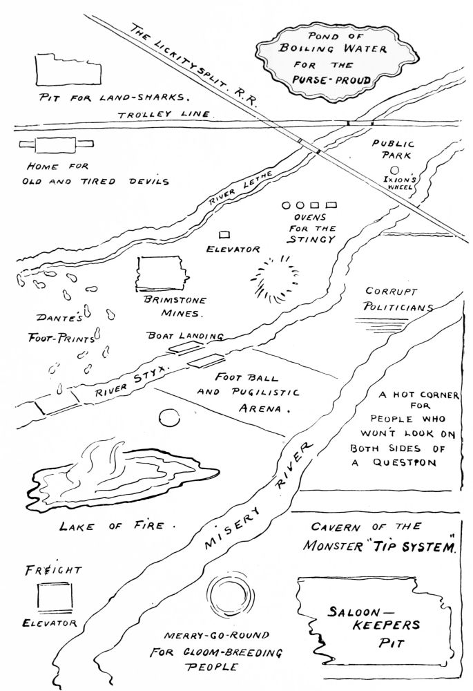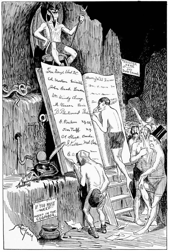 Hiprah Hunt is at the American entrance to Hell. He stands amidst a throng of Demons, sinners and employees of the realm. Crowds of men are getting overcoats checked and buying fans. He buys one himself, and also secures a guide book, locating the different sections and departments. He sees over the portal’s lofty arch the words “Leave all hope on the outside.” This demand he will not entirely accede to. He retains a little, thinking he may need it later on.
