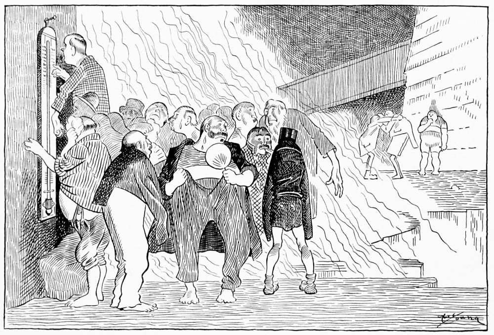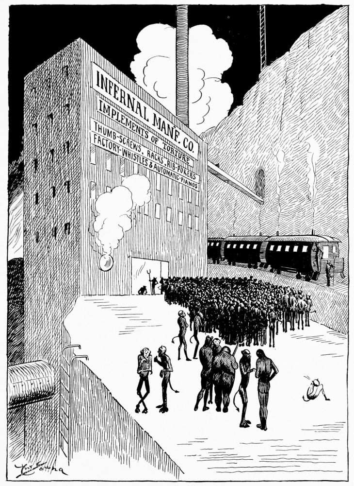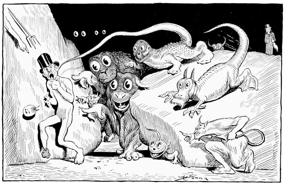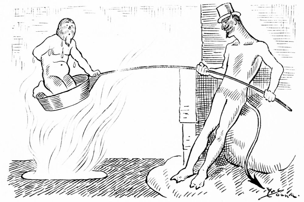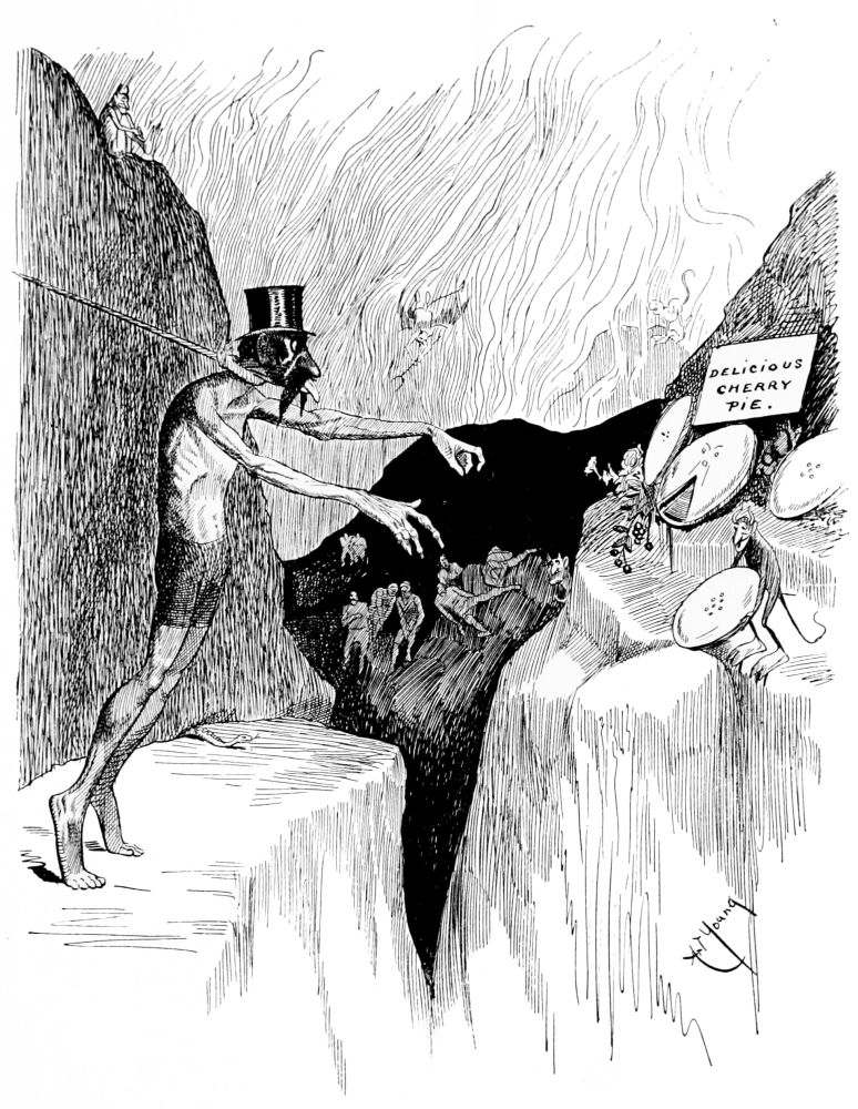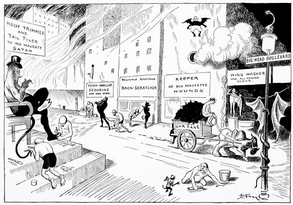 Hiprah Hunt is at the American entrance to Hell. He stands amidst a throng of Demons, sinners and employees of the realm. Crowds of men are getting overcoats checked and buying fans. He buys one himself, and also secures a guide book, locating the different sections and departments. He sees over the portal’s lofty arch the words “Leave all hope on the outside.” This demand he will not entirely accede to. He retains a little, thinking he may need it later on.