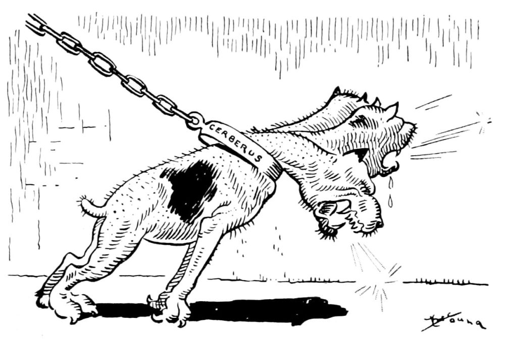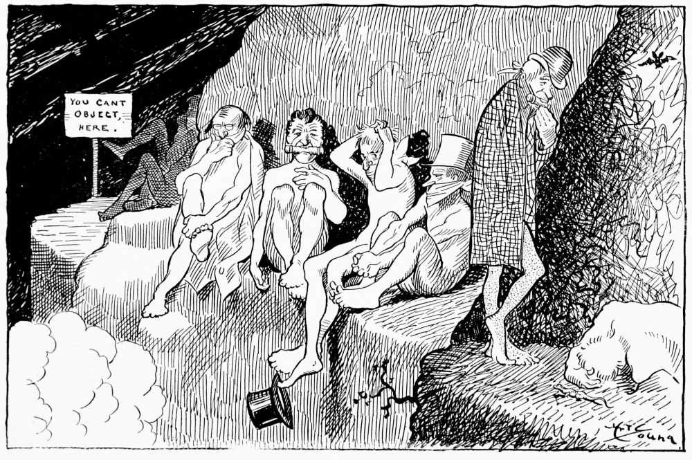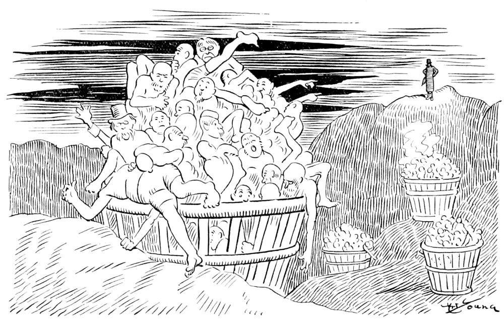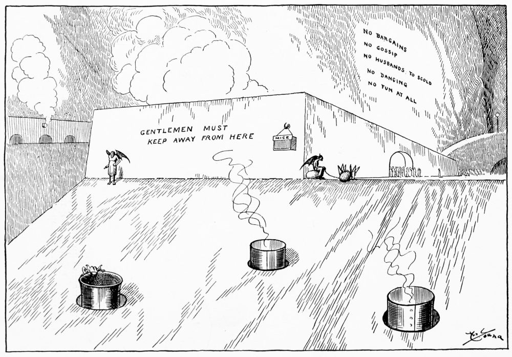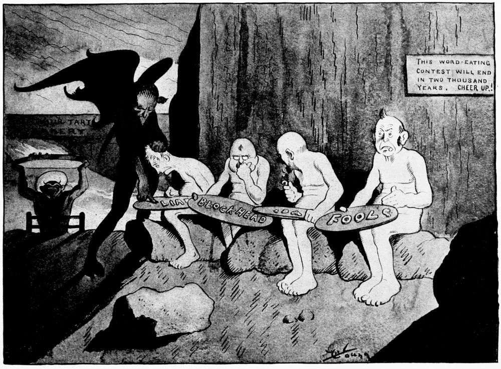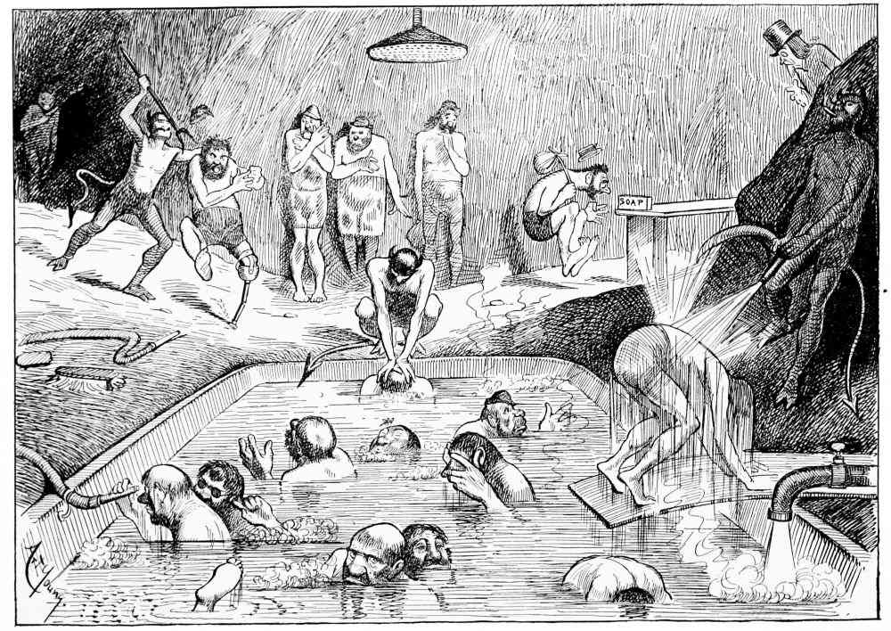 Hiprah Hunt is at the American entrance to Hell. He stands amidst a throng of Demons, sinners and employees of the realm. Crowds of men are getting overcoats checked and buying fans. He buys one himself, and also secures a guide book, locating the different sections and departments. He sees over the portal’s lofty arch the words “Leave all hope on the outside.” This demand he will not entirely accede to. He retains a little, thinking he may need it later on.