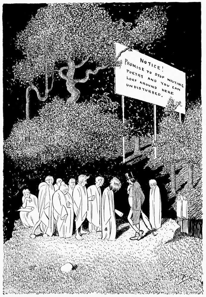 He learns that this is quite another group to that in which the ancient bard moves. These are the unworthies who spent their time on earth writing bad poetry when they would have been better engaged sawing wood or washing dishes.
