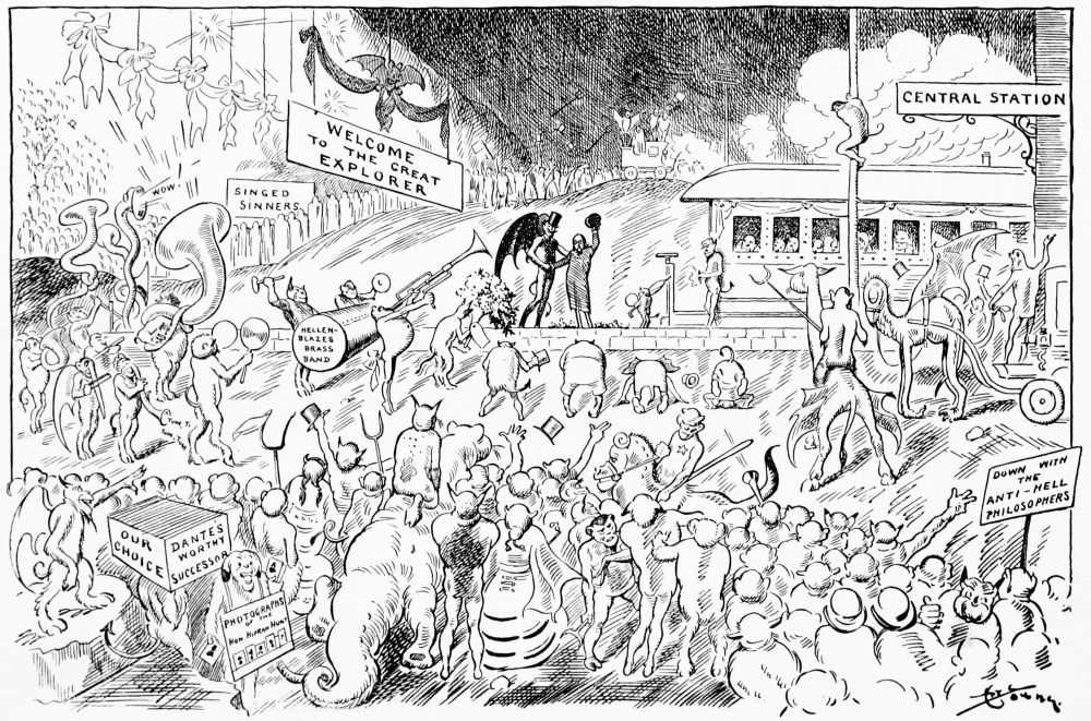 “I stand here on ground trod by the immortal Dante (loud cheers for Dante and flash of green fire), that great Italian who blazed the way for my own coming. To carry on the work of this great man is no easy task; but with the permission of your most Imperial High Ruler and yourselves, I hope to get about and see a few things that will startle millions of people who have ceased to be frightened at the thought of eternal damnation. (Loud reports of bursting thermometers.)