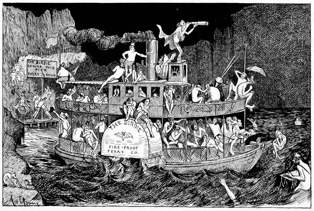 Here he sees old Charon the pilot, who started his career as the Styx ferryman with a boat hardly large enough to hold two college professors, but who now runs a large double-decked steamer fitted out with modern improvements and accommodating eight hundred souls.