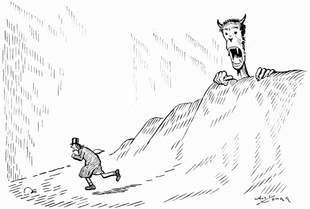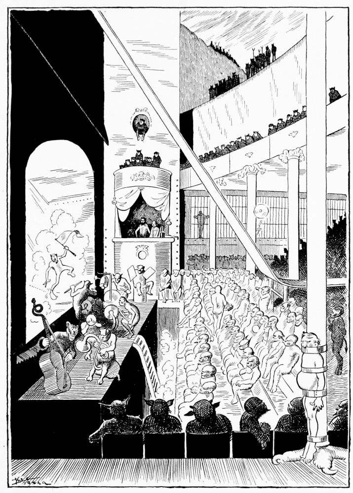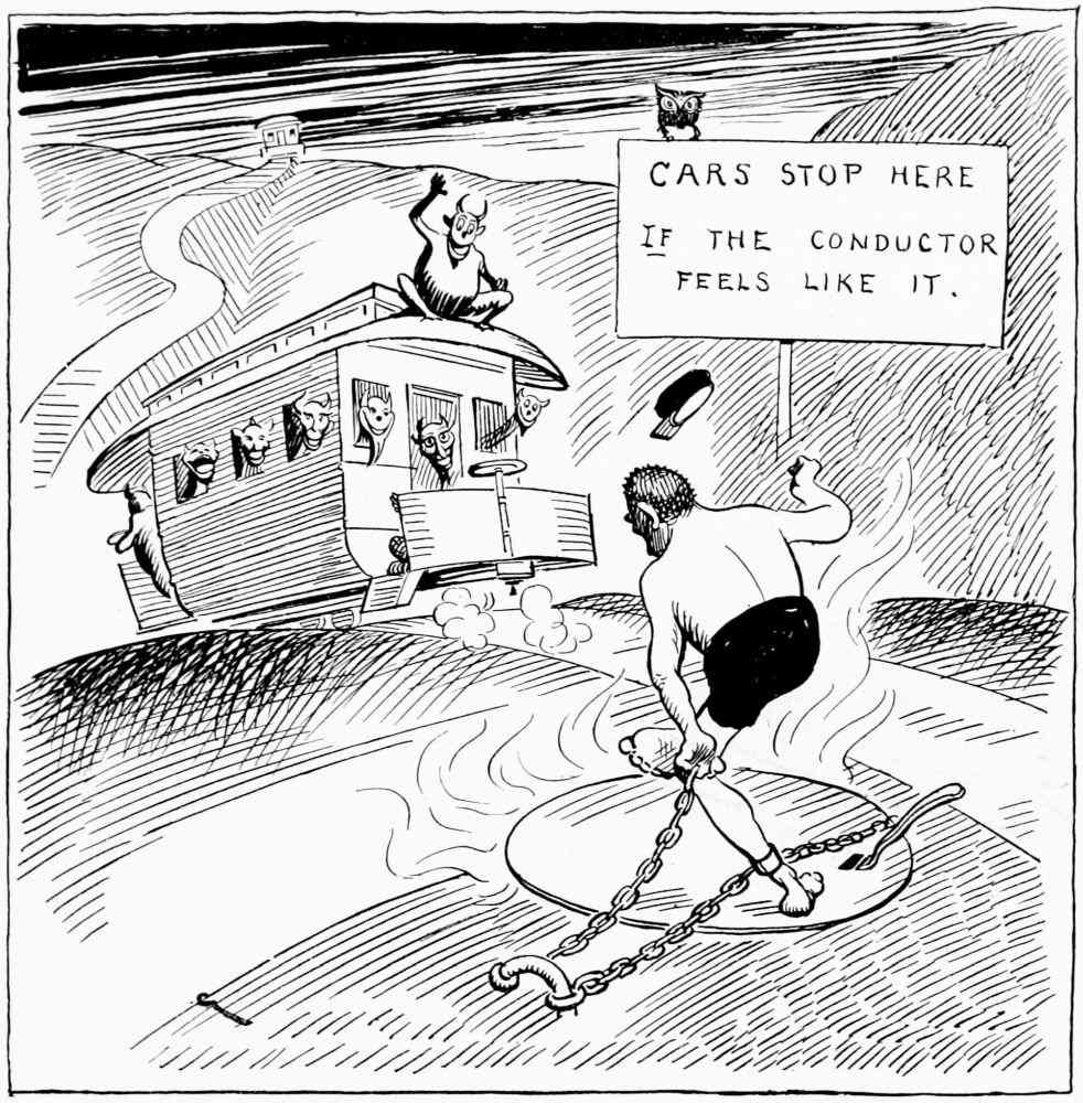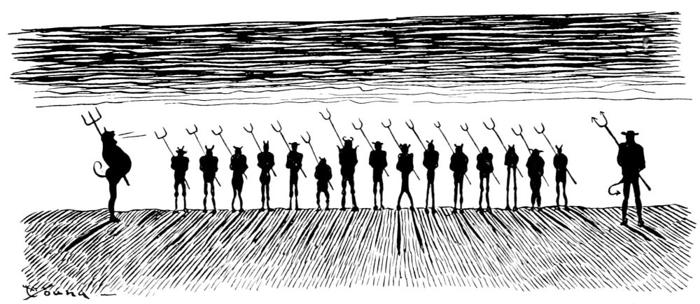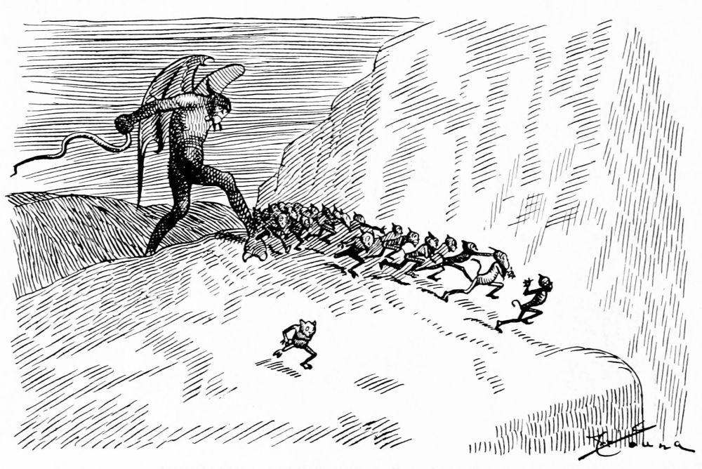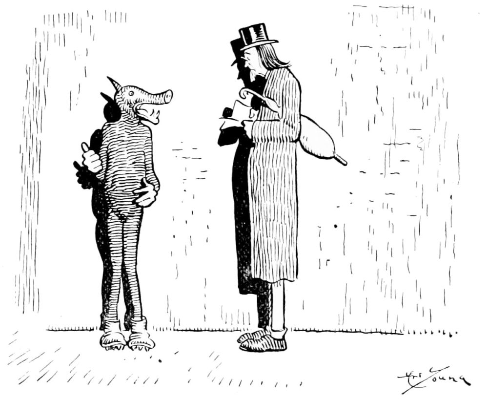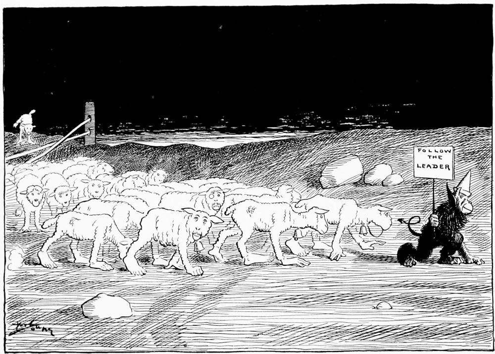 Coming into the second district Mr. Hunt is debating which way he shall proceed, when he hears a scuffling on the heated asphalt road behind him. He turns and sees passing a drove of human-footed sheep, led by a monkey, whose contortions they are compelled to imitate. Mr. Hunt consults his guide book and learns that these are the people who did things because others did them, never taking the trouble to think for themselves.
