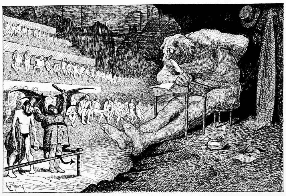 Hiprah Hunt finds himself in great danger of being cast into Hell-fire before he can make known the object of his presence. When he explains that he has been a lifelong expounder of the future punishment theory, that his purpose is to explore the region and go back to earth with the proof of his belief, Satan shows great courtesy. He immediately telephones to the heads of the departments in his realm to assemble at Plutoblitzz, the Central Station of the region, and to receive Mr. Hunt with a great ovation.