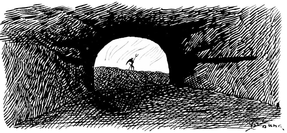 Finally, he comes to a projecting precipice from which he peers and discerns a dim light through the sluggishly rising smoke. As he crawls lower he hears voices, and a great commotion. An odor of burning brimstone fills the air. He swings out from an over-hanging rock and allows himself to drop.