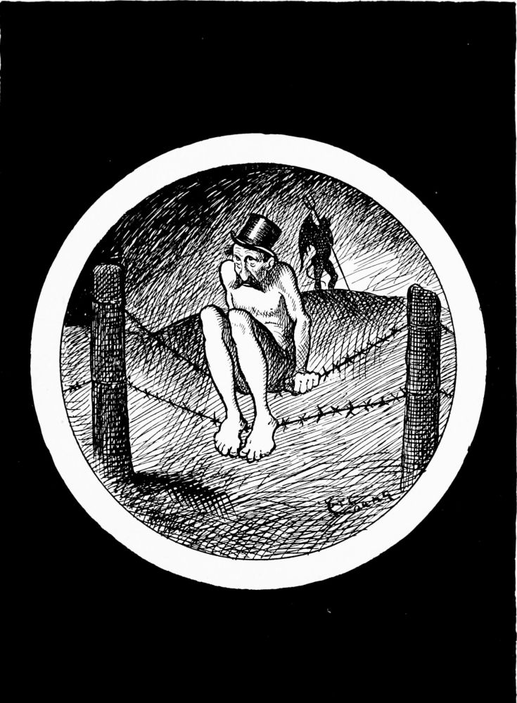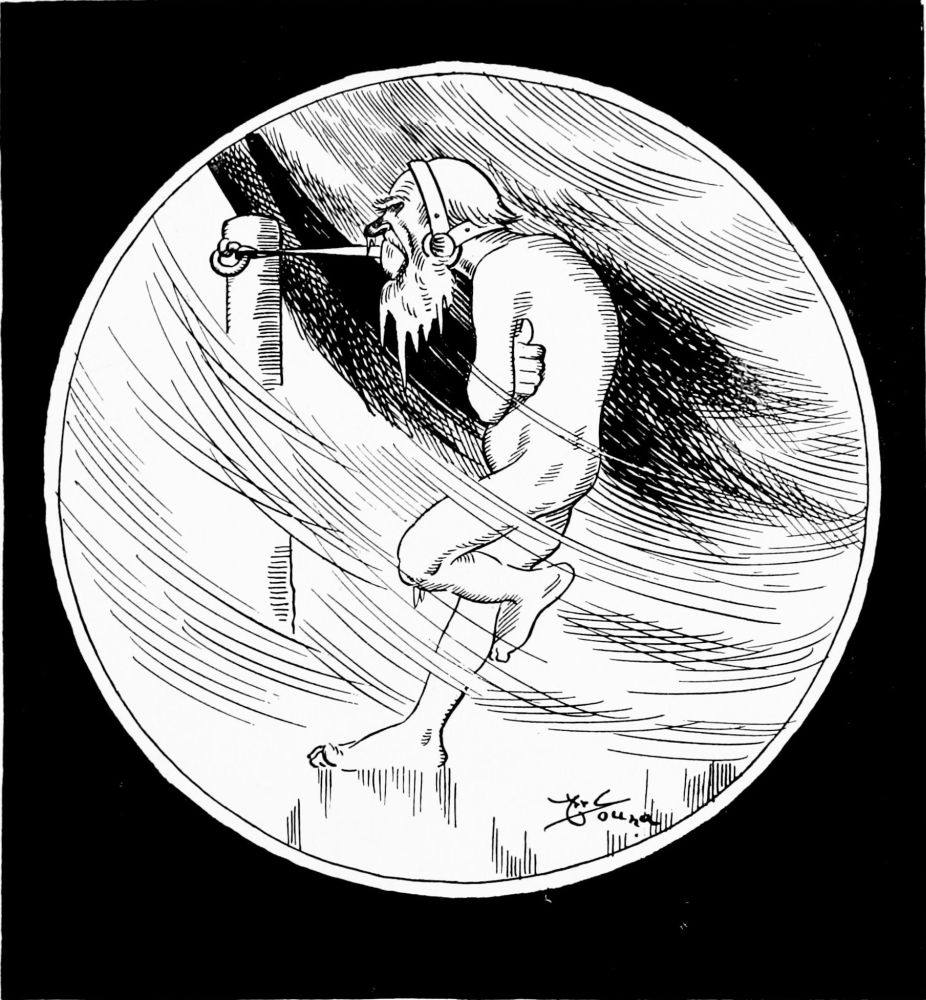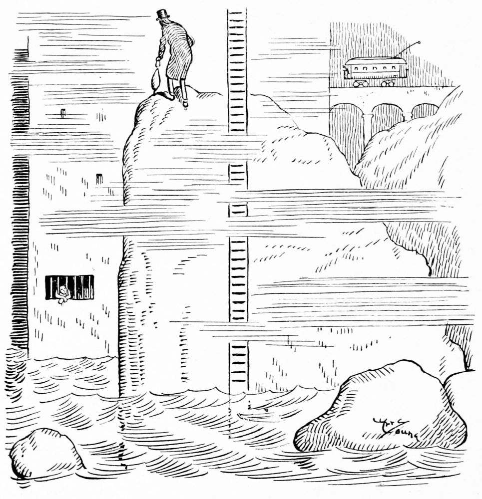 Mr. Hunt sees Charon’s boat take on a load of passengers. He watches it pull out from the pier and cross the river. An orchestra, consisting of a bass horn and an accordion, supplies the torture on the run from shore to shore. Wearing nothing but a mackintosh and gaiters the Captain stands on the roof of the pilot house grimly scanning the black waves.