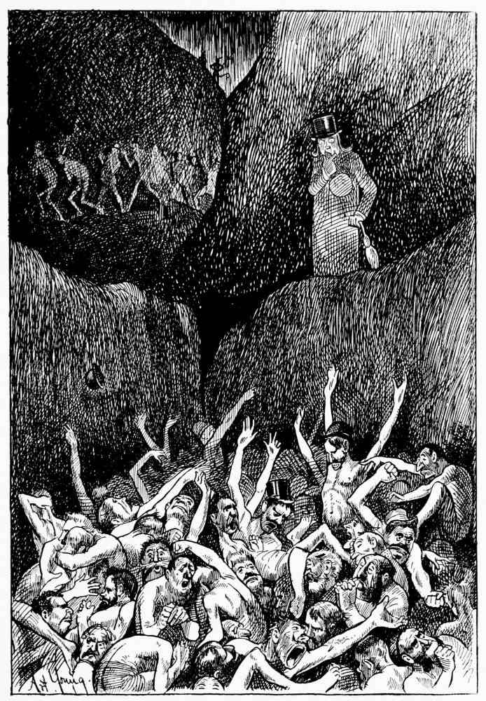 Mr. Hunt courteously declines the aid of guides whose services are offered by Satan preferring, as he explains, to go unattended, and makes his way to what is known as the first district of Hell.