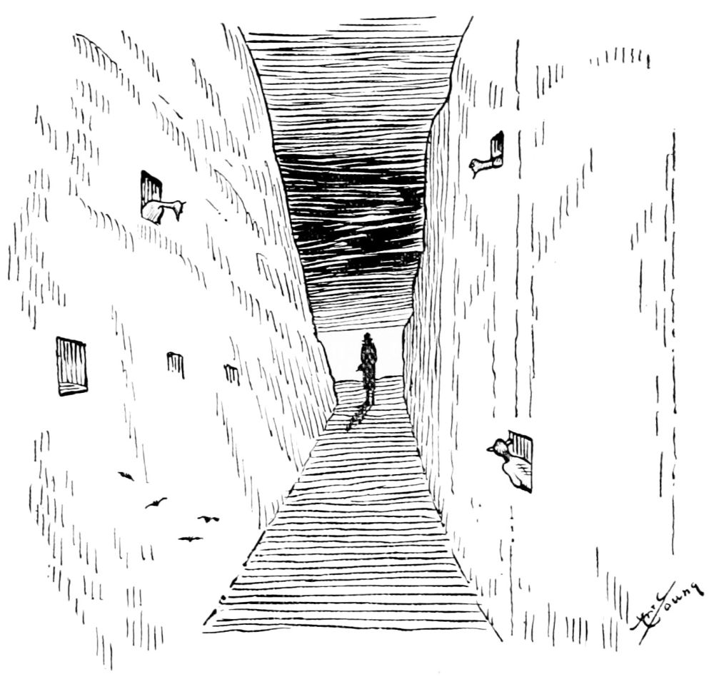The picture on the opposite page was drawn from a crude and indistinct diagram made by Mr. Hunt. The artist does not vouch for the correctness of every detail in the drawing, having restored many signs and placards which in Mr. Hunt’s original were almost obliterated.