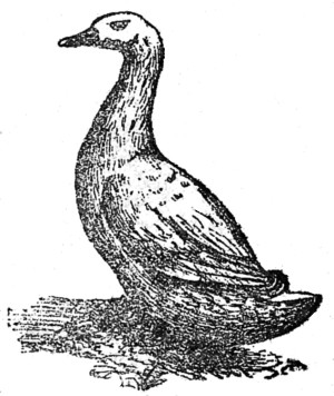 Gl'inglesi, noti abilissimi modificatori di caratteri degli animali domestici in genere, trasformatori, [13] miglioratori, sacrificando talvolta fin troppo alla mania, a detrimento di qualità intrinsiche, hanno voluto perfezionare anche l'anatra di Rouen, non tanto dal lato della livrea per la quale ottennero maggior regolarità, quanto da quello del volume che hanno reso anche più forte. È un lavoro che merita considerazione ma che non ha valore se non è seguito con la più rigorosa selezione continua, altrimenti il frutto va perduto; e poi resta a sapersi se animali così diligentemente selezionati conservino la rusticità del tipo originale. Il manto scuro del tipo inglese si ebbe probabilmente dall'incrocio del Rouen francese chiaro con quella prossima parente che è la Duclair pure normanna, ma dal piumame scurissimo; il volume poi è dovuto oltre che alla selezione, ad una alimentazione speciale ed a qualche altra misura, formante il segreto di quegli strenui allevatori.