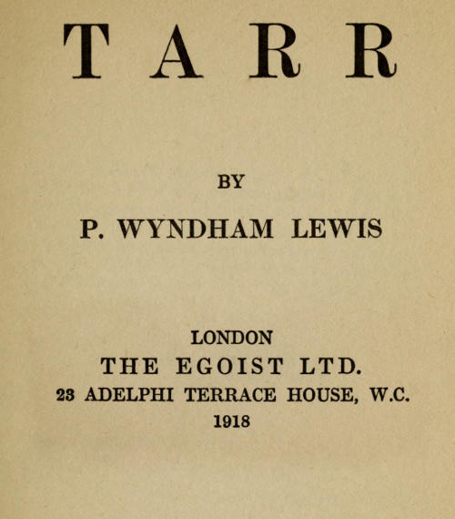 The Project Gutenberg EBook of Tarr, by Percy Wyndham Lewis This eBook is for the use of anyone anywhere in the United States and most other parts of the world at no cost and with almost no restrictions whatsoever. You may copy it, give it away or re-use it under the terms of the Project Gutenberg License included with this eBook or online at www.gutenberg.org. If you are not located in the United States, you'll have to check the laws of the country where you are located before using this ebook. Title: Tarr Author: Percy Wyndham Lewis Release Date: November 24, 2018 [EBook #58340] Language: English Character set encoding: UTF-8 *** START OF THIS PROJECT GUTENBERG EBOOK TARR *** Produced by Mary Glenn Krause and the Online Distributed Proofreading Team at http://www.pgdp.net (This file was produced from images generously made available by The Internet Archive)