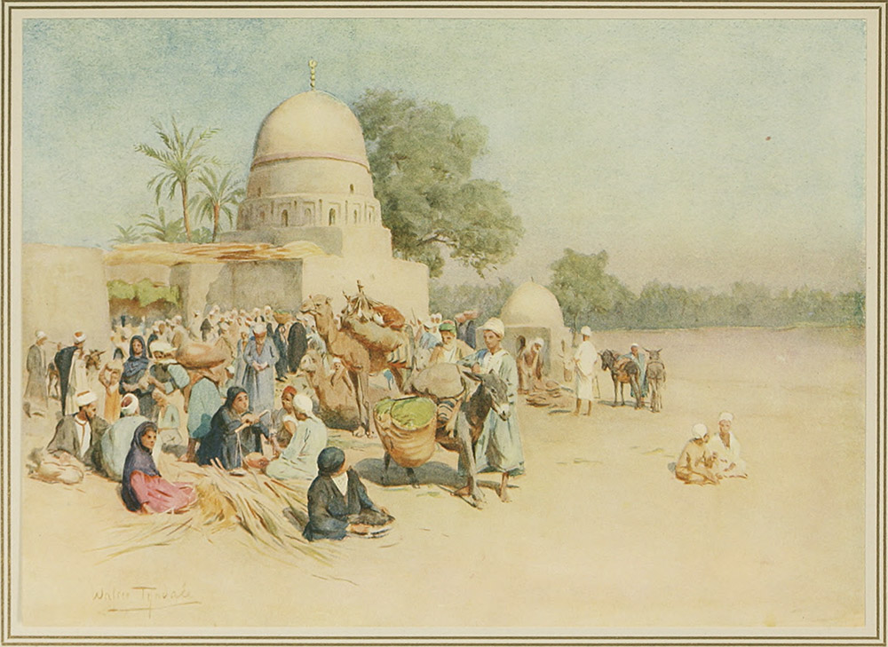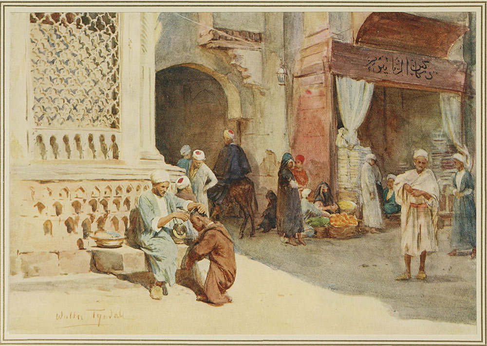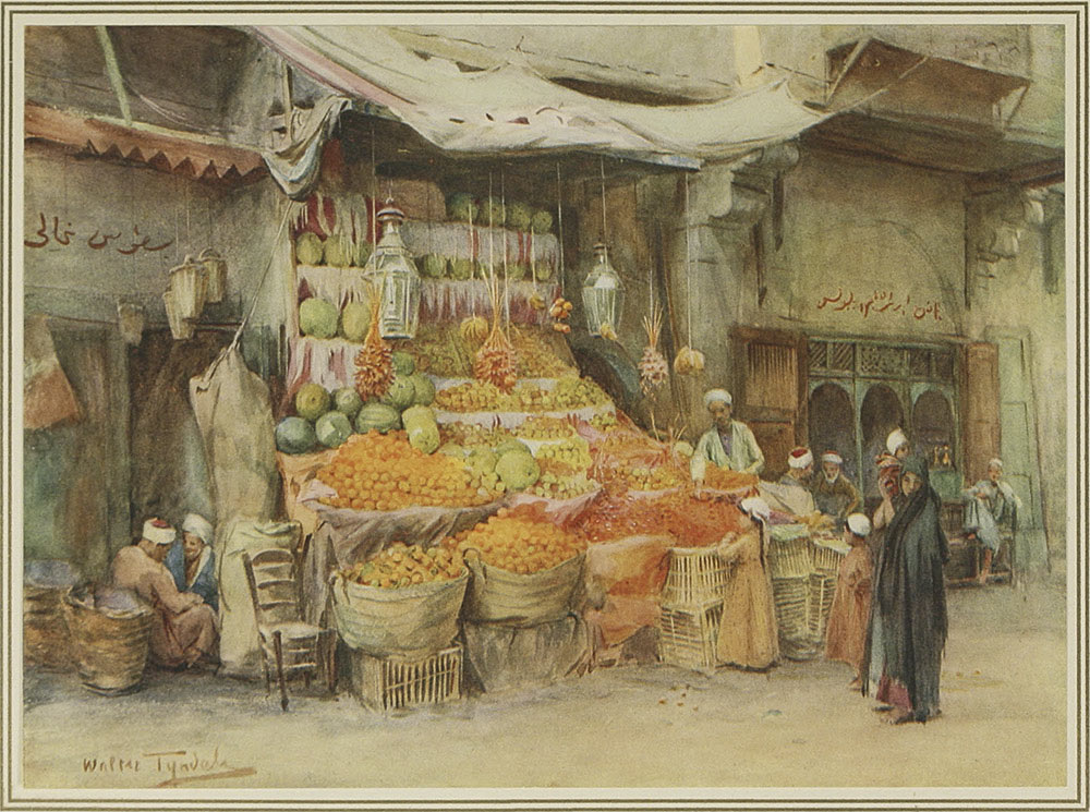 The general impression is one of light, colour, noise and movement. The detail is full of human as well as pictorial interest. Various combinations of colour—some beautiful, some inharmonious—leave ample scope to the painter to arrange his scheme. A pile of oranges and lemons, with the black and deep purple dress of the fellaha saleswoman, make a striking note in the foreground; the stacks of pitchers brought down from Balliana, in Upper Egypt, give a variety in buffs and greys, and the blue garments of the buyers are sufficiently faded not to contrast too violently. It is also a great study of types and characters. The noisy Cairene is chaffering with the quieter Shami from far Damascus for some pomegranates which are heaped before him; the Maghraby hawks a bundle of yellow slippers; Jew and Greek are trying to outdo each other in a deal over a spavined horse.