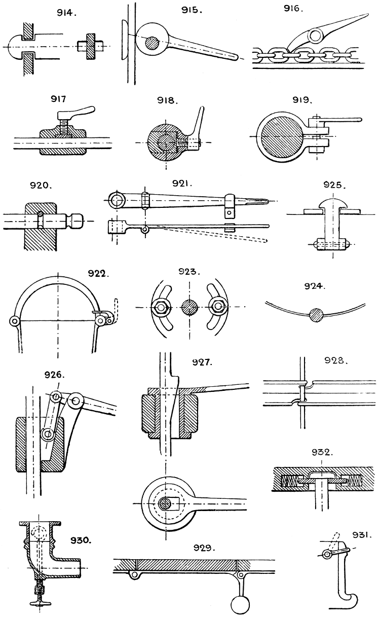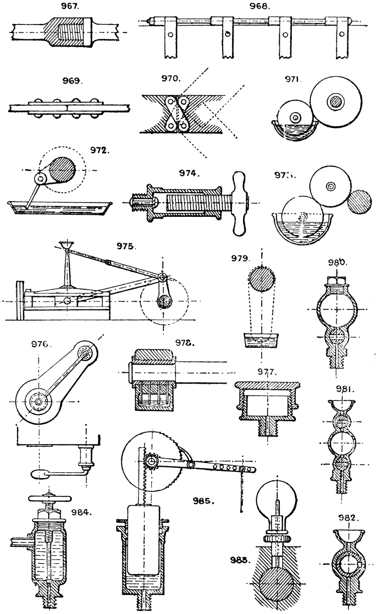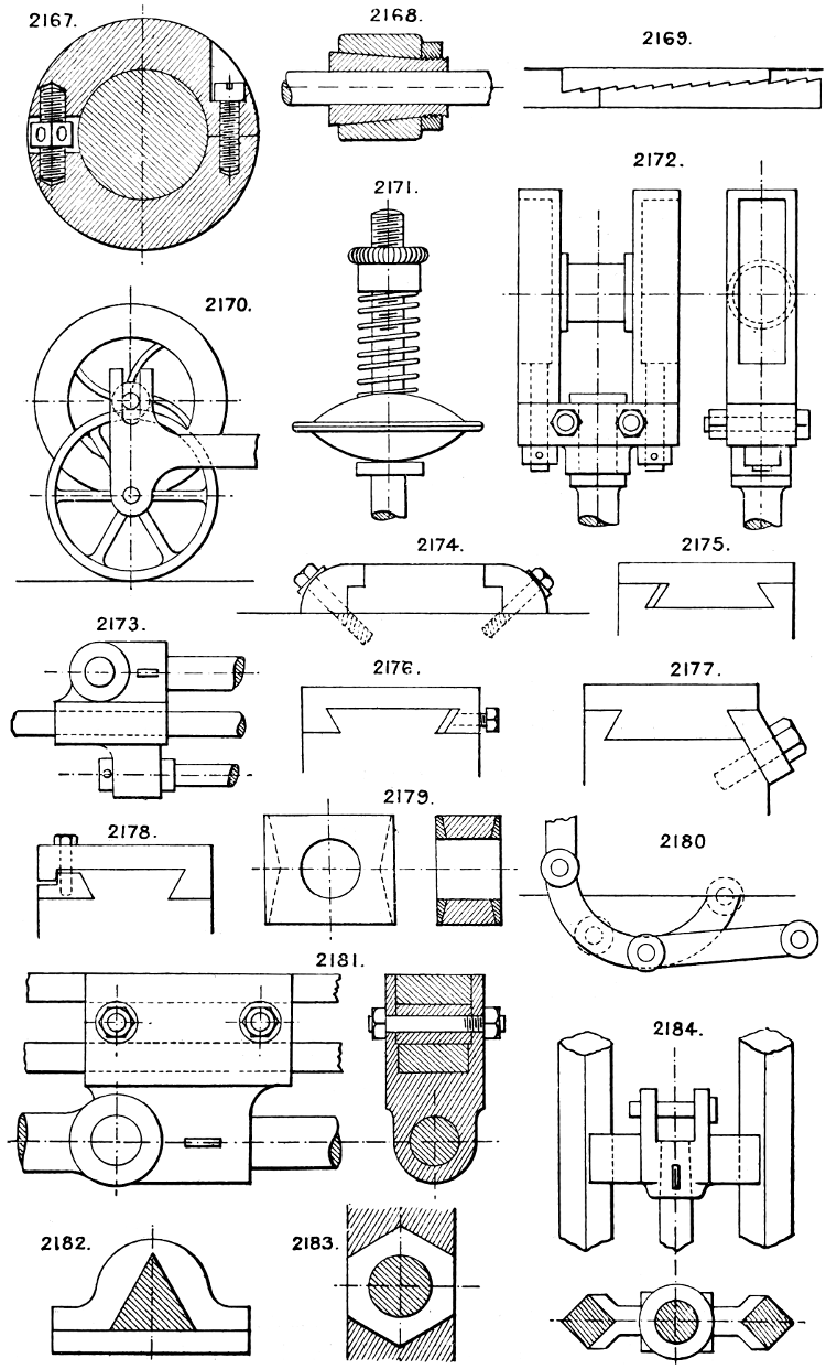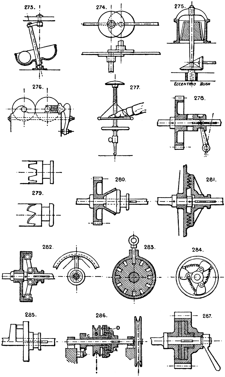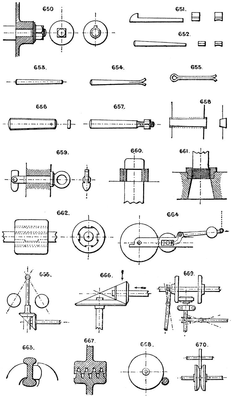 In the course of twenty-five years of such experience, I have found the want of such a volume as the present, and endeavoured to supply the deficiency in my own practice by private notes and sketches, gathered promiscuously, until the difficulty of selection and arrangement became so apparent that I began to classify them, as they exist in the following pages. A few weeks of unusual leisure have enabled me to complete this work and amplify it by numerous additions, and it is now presented in the hope that it will be found of equal service to others engaged in the head-splitting, exhausting work of scheming and devising machinery, than which I can conceive of no head-work more wearing and anxious, Several valuable works have already[vi] found numerous users, and there is no lack of admirable collections of memoranda, rules, and data for designing and proportioning the various constructive details of machinery; but, as far as I am aware, there is no work in existence which aims at the same purpose as is attempted in the following pages, viz. to provide side by side suggestive sketches of the various methods in use for accomplishing any particular mechanical movement or work, in a form easily referred to, and devoid of needless detail and elaboration. A sketch, properly executed, is—to a practical man—worth a folio of description; and it is to such that these pages are addressed. For the same reason it has been deemed undesirable to add to the various sketches any rules or tables relating to strengths or dimensions, which may be found in numerous well-known volumes.