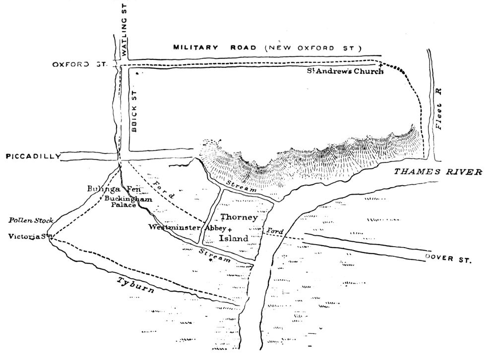 This ford, the only one across the river for many miles up stream, belonged from time immemorial to the highway, a road or beaten track leading from the north of England to the south, and “tapping” the midland country on the way. The road which the Saxons called Watling Street, when it reached this neighborhood, ran straight down Park Lane, or Tyburn Lane, as it was formerly called, to the edge of the marsh. There it ended abruptly. If you will draw this line on any map, you will find that it ended at the western extremity of St. James’s Park, just about Buckingham Palace, where the marsh began. At this point the traveler plunged into the shallow waters, and guided by stakes, waded—at low tide there were, haply, stepping-stones—across the swamp to Thorney. Here, if the tide served, he again trusted himself to the guidance of stakes; and so, breast high, it may be, waded through the river till he reached the opposite shore, where another high road, “Dover Street,” which{12} also broke off abruptly at this point, awaited him. Later on, when London Bridge was built, Watling Street was diverted at the spot where now stands the Marble Arch, was carried along the present Oxford Street and Holborn, and passed through the City to the Bridge. This alternative route probably took away a great deal of the traffic: but for those who had business in the south or the southwest, or for those who were bound for the port of Dover, the ford was still preferred as the shorter way. A bridge was convenient, but the traveler of the fourth century was accustomed to a ford. Those who had no business in London were not likely to be turned out of their way by another ford, after they had crossed so many.