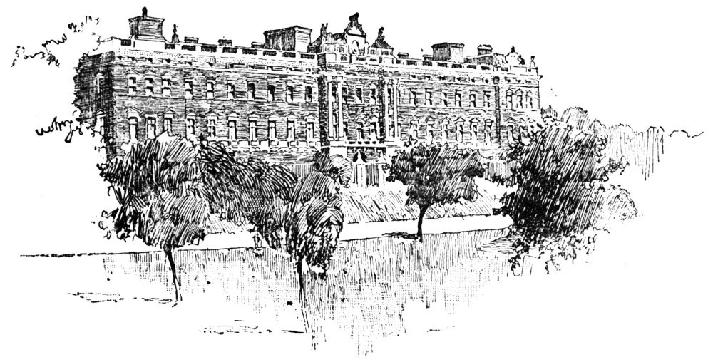 Thus fortified, the Palace assumed something of the{48} usual plan of a Norman castle. The Outer Bailly was represented by the New Palace Yard, with its Clock Tower and place for martial exercises, ridings, and tournaments. Westminster Hall faced the Outer Bailly; to right and to left, to east and to west, stood buildings; on the south were other buildings which inclosed the Inner Bailly, now Old Palace Yard; south of these were gardens and stables with less important houses, offices, and barracks. The great mass of the Palace buildings was between Westminster Hall and the river.