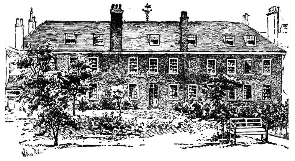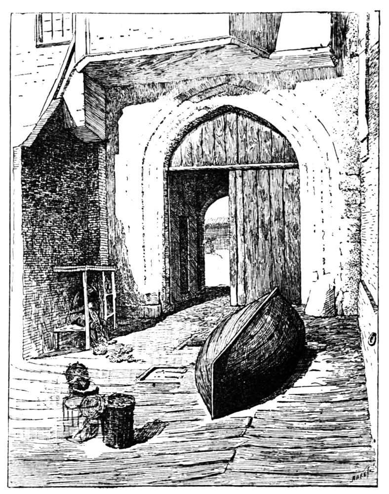 In course of time the river was embanked, and ran in a deeper channel; then the ford, as has been stated above, vanished, and the marshes were partly reclaimed, only pools remaining on both sides of the river—the Southwark pools remained till the beginning of this century. But Thorney, after the drying of the marsh, continued to be an island. On the north, the west, and the south sides it was bounded by streams; on the east by the Thames. If you will take the map, and draw a line through Gardener’s Lane across King Street to the river, you will be tracing the exact course of the rivulet which ran into the Thames and formed the northern boundary of the island; another line, down Great College Street, marks the course of a second stream; while a third line, down De la Hay and Prince’s Streets, joining the other two, marks the lie of a connecting canal called Long Ditch. It is interesting to walk along the narrow Gardener’s Lane, one of the few remaining old streets of Westminster, and to mark how the road presents a certain unmistakable look of having been the bed of a stream; it bends and curves exactly like a stream. The same thing may be imagined—by a person of imagination—concerning Great College Street.