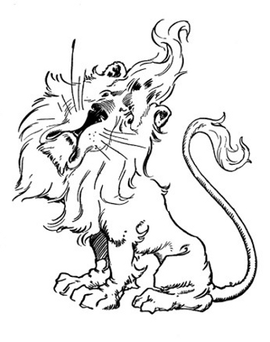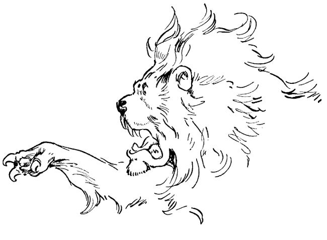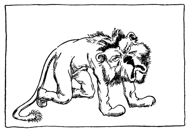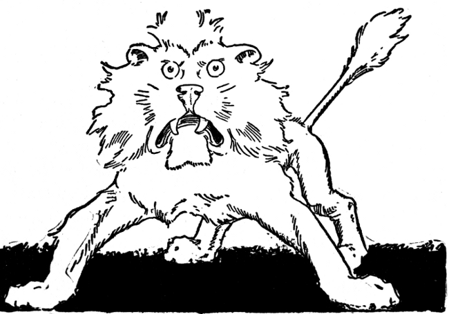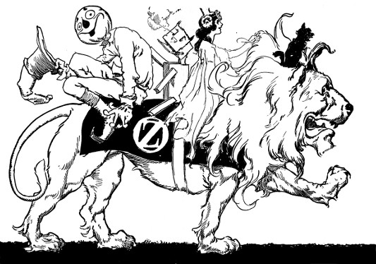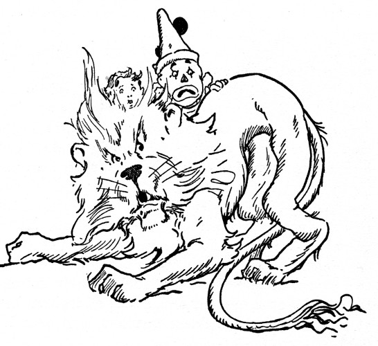 "The Cowardly Lion is one of the most unusual and celebrated lions in Oz. For many years he ruled over the forest kingdoms, but in the reign of the famous Wizard of Oz the Cowardly Lion was discovered by a little Kansas girl named Dorothy. He became so attached to Dorothy that he accompanied her on her journey to the Emerald City, saving her life many times on the way, and proving so brave, in spite of his cowardice, that he won the love and admiration of all Oz. Since then he has spent most of his time in the capital city, sharing in all the adventures of court celebrities, and of Dorothy, who has been made a Royal Princess. He has, by his many brave deeds, endeared himself to the whole populace and—"