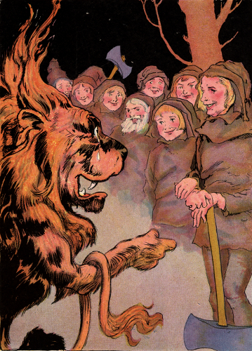 The Cowardly Lion entertains the wood cutters with his conversation Chapter 9