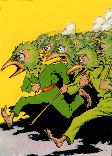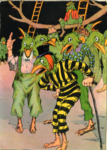 In olden Oz times the Mudgers used to descend upon the helpless little countries that surrounded them and carry off everything of value. But Glinda, the good sorceress of Oz, put a stop to that. One night, flying over Mudge in her swan chariot, she had dropped a blue book and it had fallen on the oldest Mudger in the kingdom, hitting him a terrible blow on the nose. It had been a blow to them all, for in gold letters on the first page of the book stood this sentence: