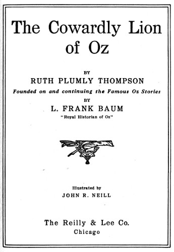 Project Gutenberg's The Cowardly Lion of Oz, by Ruth Plumly Thompson This eBook is for the use of anyone anywhere in the United States and most other parts of the world at no cost and with almost no restrictions whatsoever. You may copy it, give it away or re-use it under the terms of the Project Gutenberg License included with this eBook or online at www.gutenberg.org. If you are not located in the United States, you'll have to check the laws of the country where you are located before using this ebook. Title: The Cowardly Lion of Oz Author: Ruth Plumly Thompson Illustrator: John R. Neill Release Date: January 24, 2019 [EBook #58765] Last Updated: February 14, 2019 Language: English Character set encoding: ASCII *** START OF THIS PROJECT GUTENBERG EBOOK THE COWARDLY LION OF OZ *** Produced by Greg Weeks, Mary Meehan and the Online Distributed Proofreading Team at http://www.pgdp.net