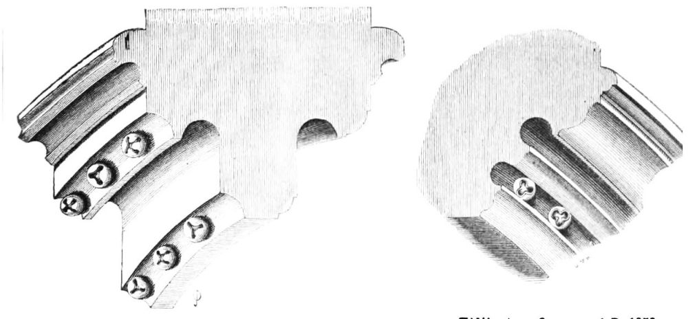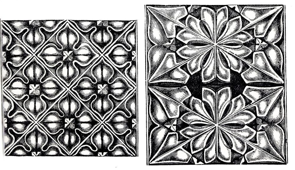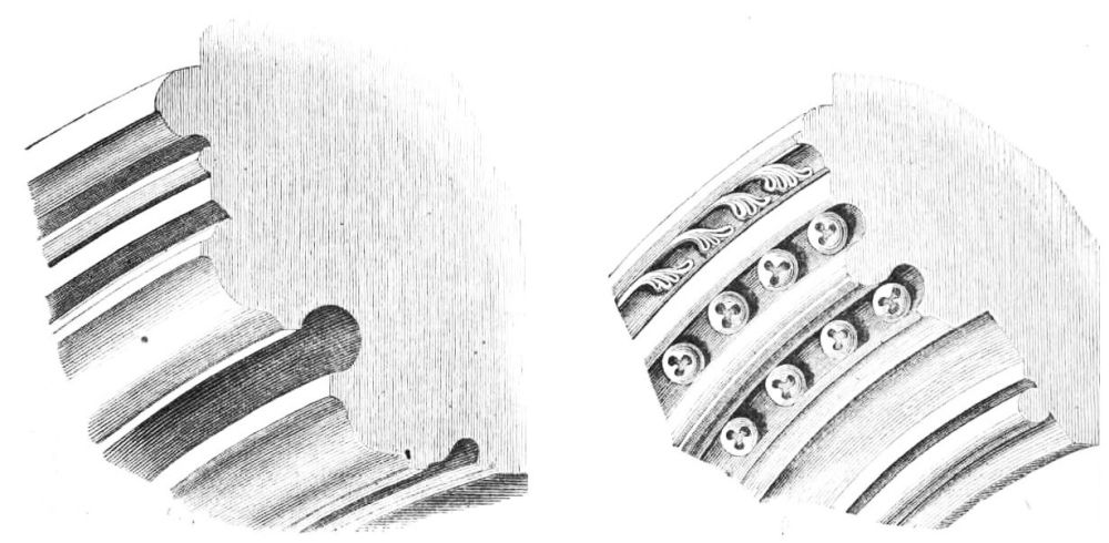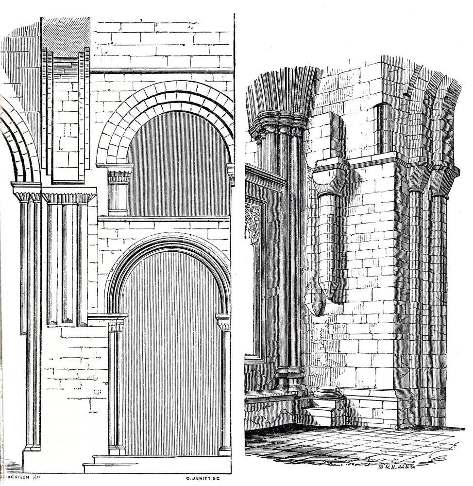Peterborough Cathedral was begun from its foundations in 1117 by John de Seez, who formed the plan of the whole of it, which was rigidly carried out by his successors, and it was consecrated in 1143; the work is very good, but not very rich. The Norman tower at Bury St. Edmund’s was commenced in the same year, 1117, and finished in 1130; the porch is an addition{32} about half a century later. The nave of Norwich was built between 1122 and 1145: the work is still very plain, being in continuation of the previous work. Castor Church, Northamptonshire, bears an inscription recording its dedication in 1124: the tower is good, rich Norman work; the ornaments are the hatched, the square billet, and the scollop, all of very simple character, shallow, and easily worked. Furness Abbey was founded in 1127, but very little of the original work remains. In Canterbury Cathedral, the work of Prior Ernulf, under St. Anselm, was completed in 1130, and part of Rochester, where Ernulf had become bishop, in the same year; so that we need not be surprised at finding more ornament in these two cathedrals than is quite consistent with the usual character of early Norman work, and the same ornaments repeated in both these churches. St. Martin’s priory at Dover was founded in 1131; the refectory is still standing, and is a good example of plain Norman work, neither very early nor very late.