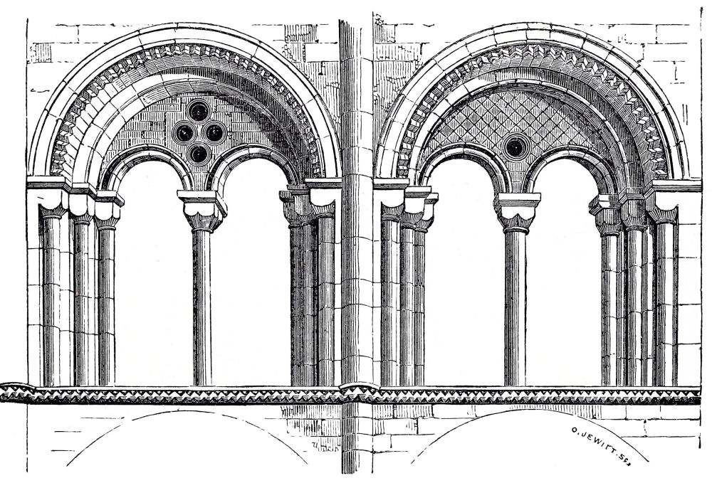 Norman Windows are in general long and rather narrow round-headed openings, but sometimes of two lights divided by a shaft, included under one arch, more especially in belfries; in rich buildings they are frequently ornamented in the same manner as the doorways, with recessed arches, zig-zag and other moldings, as at Iffley, Oxfordshire, and sometimes with sculpture; other examples have shafts in the jambs carrying the{43}