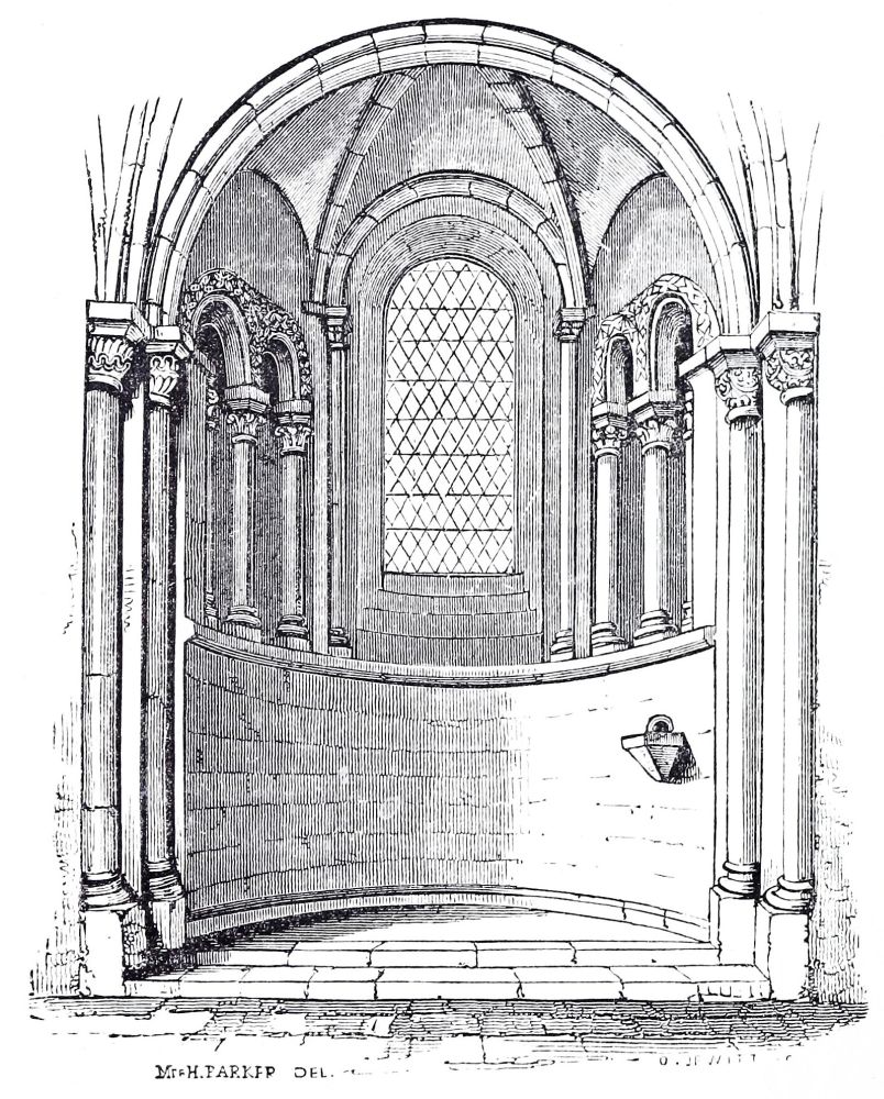 Here it may be well to mention, that down to the early Norman period the eastern limb of a cruciform church, or the chancel of a plain oblong plan, was always short, rarely more than a single square, or at the utmost two squares, in length, and was frequently terminated by a round east end called an apse. Immediately after this period the custom of lengthening the eastern limb of the church became so general, that the original dimensions have been almost lost sight of. The history of nearly every one of our cathedrals gives the same result: first, the choir was lengthened by the{39} addition of a presbytery, and afterwards still further by adding a lady-chapel, which did not come into fashion until quite the end of the twelfth century.
