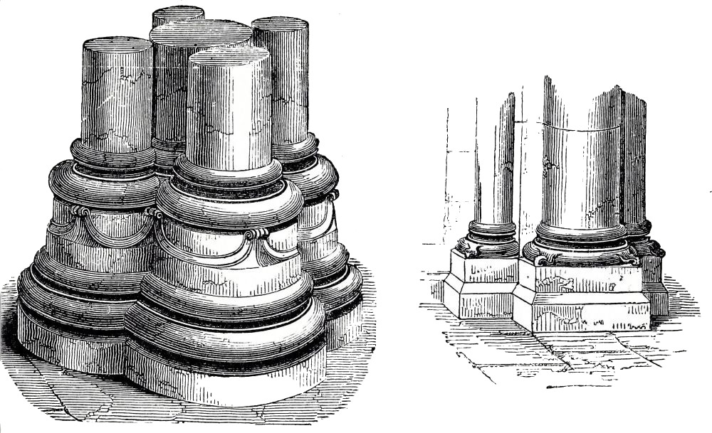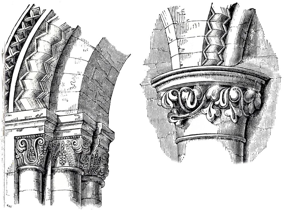 In this work I have purposely omitted the remains of Roman villas, and of the churches between the Roman and the Norman period, of which the remains are more numerous than is generally supposed, especially the substructures, or crypts as they are called, and there are several churches of the eleventh century that do not belong to the Norman style. The Saxons appear to have been more advanced in the fine arts such as{7} Sculpture than the Normans, but their churches were on comparatively a small scale, and were generally swept away by the Normans as not worth preserving: every one of our cathedrals was rebuilt by the Normans, and not always exactly on the same site, the old church being sometimes kept for use whilst the new one was building. Although these remains are of great interest to the antiquary, they have nothing to do with the history of Gothic architecture, which is certainly developed from the Norman, and the change did not begin till after the middle of the twelfth century, or about a century after the introduction of this style by Edward the Confessor: the remains of his abbey at Westminster are clearly Norman, and quite distinct from the Saxon character, but this style is called by the French antiquaries ANGLO-NORMAN, and this is quite correct. Normandy was then a province of the dominions of the King of England, and there are scarcely any buildings in Normandy earlier than the time of the Conquest.