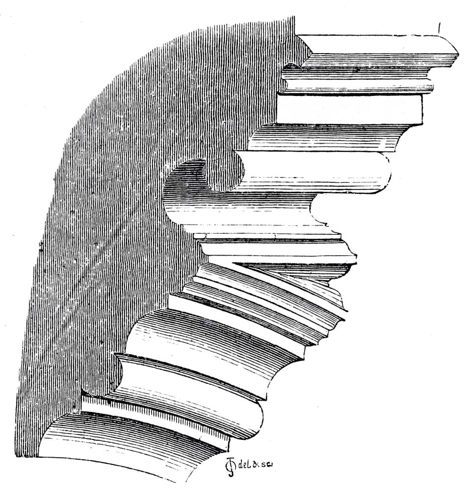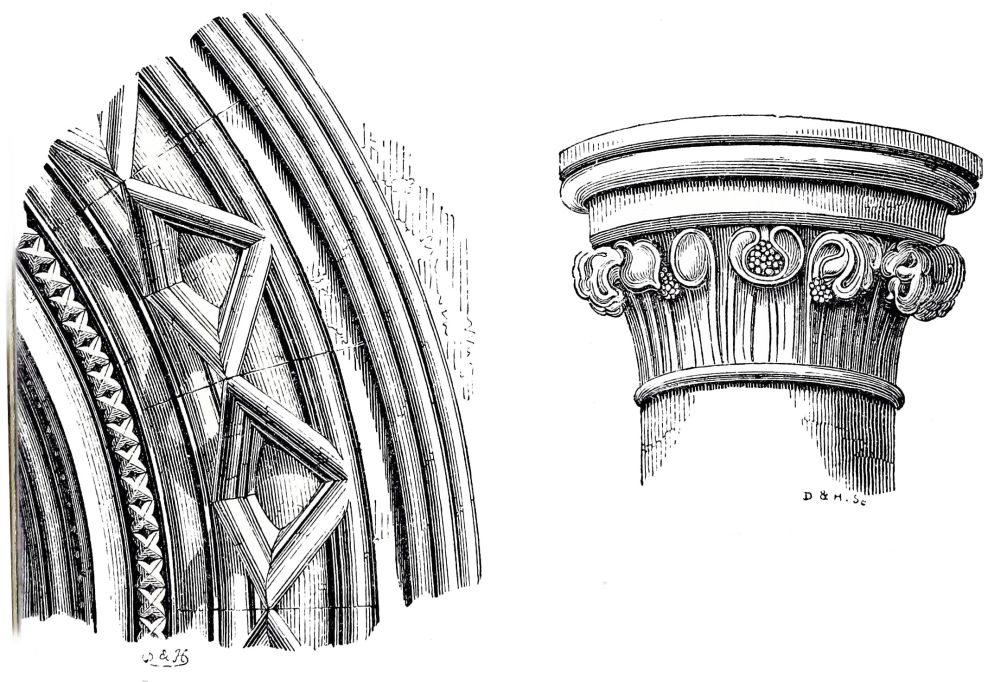 Rich Doorways form one of the most important features of late Norman work. The examples given from Cuddesdon and Middleton Stoney are good ordinary specimens, such as may be found in scores of parish churches. They are generally round-headed, very deeply recessed, and frequently have shafts in the jambs. The tympanum is frequently filled with rich sculpture, which becomes deeper and better executed as the style advances. The moldings are numerous, but not of much variety in section,{41}