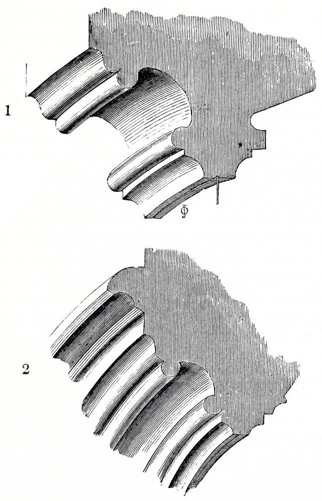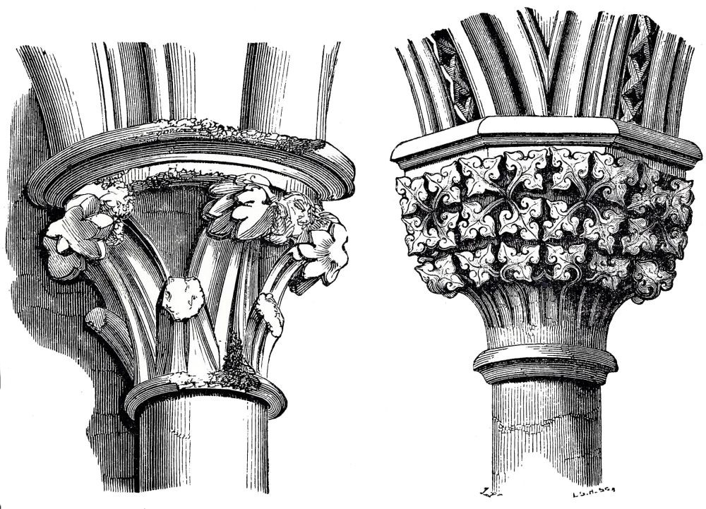 We find in early Norman work that the chisel was very little used; most of the ornaments are such as could be readily worked with the axe, and whatever sculpture there is appears to have been executed afterwards, for it was a general practice to execute sculpture after the stones were placed, as is evident in the early work at Westminster: some of the capitals in the crypt of Canterbury are only half finished to{37} this day, the work of carving having probably gone on until it was stopped by the great fire in 1174. If the sculpture is early it is very rude, and the work is shallow. But shallowness of carving depends partly on the nature of the material to be carved; from this cause buildings of a hard stone, such as granite, often appear much older than they really are. Baptismal fonts especially are frequently made of hard stone or marble, which admit of shallow sculpture; and rich Norman work cut shallow may be found as late as the time of Henry II.
