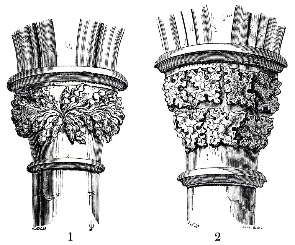 The nave and transepts of Ely were erected by Abbot Simeon, brother of Bishop Walkelyn. Part of the west front of Lincoln was built by Bishop Remi, or Remigius, 1085-1092: the small portion which remains of this work is a very valuable specimen of early Norman, the{24} more so that the insertion of later and richer Norman doorways by Bishop Alexander, about fifty years afterwards, enables us to compare early and late Norman work, while the jointing of the masonry leaves no doubt of the fact that these doorways are insertions, and therefore confirms the early date of the three lofty arches under which they are inserted. A comparison of the capitals and details of these two periods, thus placed in juxtaposition, is extremely interesting. The wide-jointing of the masonry and the shallowness of the carving distinguish the old work from the new. Several capitals of the later period are inserted in the older work, as is shewn on careful examination by the jointing of the masonry, and by the form of the capitals themselves: the earlier capitals are short, and have volutes at the angles, forming a sort of rude Ionic; the later capitals are more elongated, and have a sort of rude Corinthian, or Composite foliage.