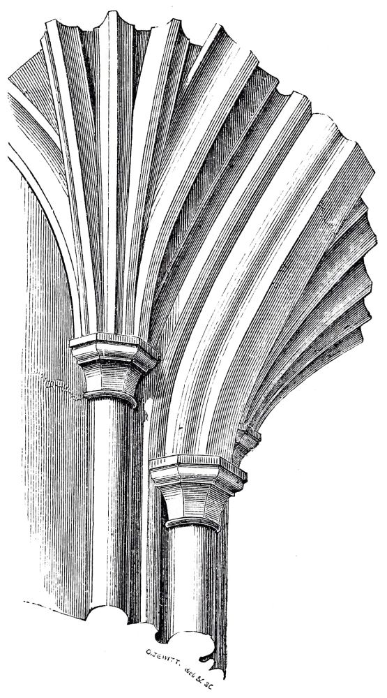 THE Norman style was introduced into England in the time of Edward the Confessor; the king himself founded the great Abbey of Westminster, and many of the buildings were begun in his time. Of this church he had completed the choir and transepts, which were sufficient for the performance of divine service, and it was then consecrated, Dec. 28, 1065, a few days only before his death. As soon as the choir of a church was ready for Divine Service, it was usual to consecrate it: the nave was called the vestibule, and was not consecrated. The nave of Westminster at that time was not built: it is probable that a nave was built in the twelfth century, but of this church we have no remains. The dormitory was in all probability building at the same time, as the monks or canons who had to perform the service in the church must have required a place to sleep in. Of this dormitory the walls and the vaulted substructure remain. The refectory also was begun at the same period, and we have the lower part of the walls, with the arcade{11}