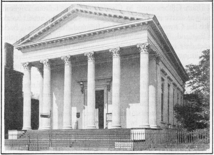 On the southeast corner is St. Michael’s Church, on the site of the original English church, St. Philip’s. In its yard sleep illustrious Charlestonians, including James Louis Petigru, the epitaph on whose grave is famous. On the northeast corner is the City Hall, with its great municipal art gallery, including John Trumbull’s renowned portrait of General George Washington. This was the building of the United States Bank, on the site of the early market place. Behind and beside the City Hall, Washington Park, in the northwest corner of which is the country’s first fireproof building.