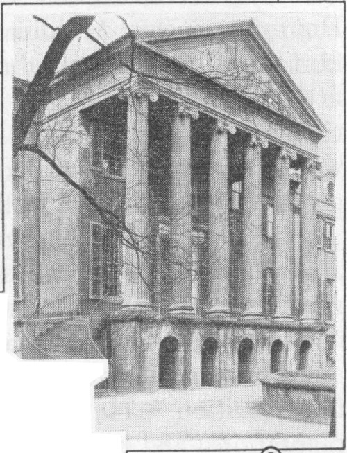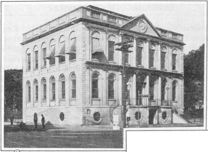 Continue north in Meeting Street. At No. 51 is the home of Governor Robert Francis Withers Allston, some time a convent of the Sisters of Mercy, now the home of Francis J. Pelzer. At the southwest corner of Meeting and Tradd Streets is the First (Scotch) Presbyterian Church, organized in 1731, an offspring of the old White Meeting House. On the northwest corner is the old Branford (also called Horry) home, the portico over the street being less ancient. On the east side (No. 72) is the hall of the South Carolina Society, which also houses the St. Andrew’s Society, founded in 1729; in this building are tables and chairs used in the Secession convention. On the west side is the post office park, including the site of the old Charleston Club, and of the United States courthouse that collapsed in the earthquake of August 31, 1886. On the southwest corner of Meeting and Broad Streets is the United States post office, completed in 1896; this houses the United States court. On the northwest corner is the county Court House, on the site of the old State House, burned in 1788. Behind the Court House is the Daniel Blake double house, one of the first of its kind in the country.