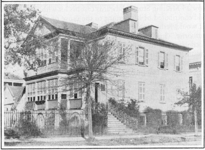 On the north side of Broad Street, No. 118, is the site of St. Andrew’s Society hall in which President James Monroe and the Marquis de Lafayette were guests of the city, Monroe in 1819 and Lafayette in 1825; in which the Ordinance of Secession was adopted December 20, 1860. Next door, No. 116, is the former house of John Rutledge, “The Dictator,” later Chief Justice of the Supreme Court of the United States; here President William Howard Taft was the guest of Robert Goodwyn Rhett. No. 114, once the home of Colonel Thomas Pinckney, is the residence of the Bishop of Charleston, the Most Reverend Emmet Walsh. No. 112 12 is the Ralph Izard house; the coach house in the yard is one of the most picturesque in Charleston. This neighborhood was in Mr. Hollybush’s farm, just outside of old Charles Town. No. 100 Broad Street was at one time the residence of James Louis Petigru.