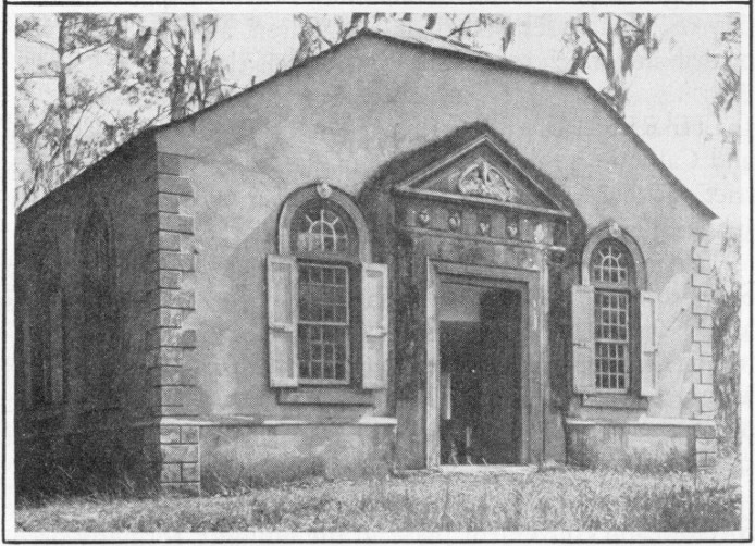 ST. JAMES, GOOSE CREEK, off the Coastal Highway: The British Royal Arms still stand in South Carolina! The British yoke was thrown off one hundred and sixty years ago, but in St. James Church, Goose Creek, sixteen miles from 34 the city hall of Charleston the Royal Arms have never come down! The ancient edifice stands in a tranquil woodland, quite near The Oaks, home of Arthur Middleton in early years. At the foot of the altar is a tomb with this inscription: “Here lyeth the body of the Reverend Francis Le Jau, Doctor in Divinity, of Trinity College, Dublin, who came to this Province October, 1706, and was one of the first missionaries sent by the honourable society to this Province, and was the first Rector of St. James, Goose Creek, Obijt. 15th September, 1717, ætat 52, to whose memory this stone is fixed by his only Son, Francis Le Jau.” In the records left by Dr. Le Jau is mentioned that he christened Indians. Four acres for the old parsonage were the gift of Arthur Middleton, and another pioneer gave the Glebe of one hundred acres. The cherubs in stucco over each of the keystones are famous and so is the pelican feeding her young, over the west door. Interesting memorial tablets have places. In the present day this picturesque and historic church is easily reached by automobile. Each year at Easter divine services are held in the church, the congregation invariably overflowing the building. The original church was built soon after Dr. Le Jau’s arrival.