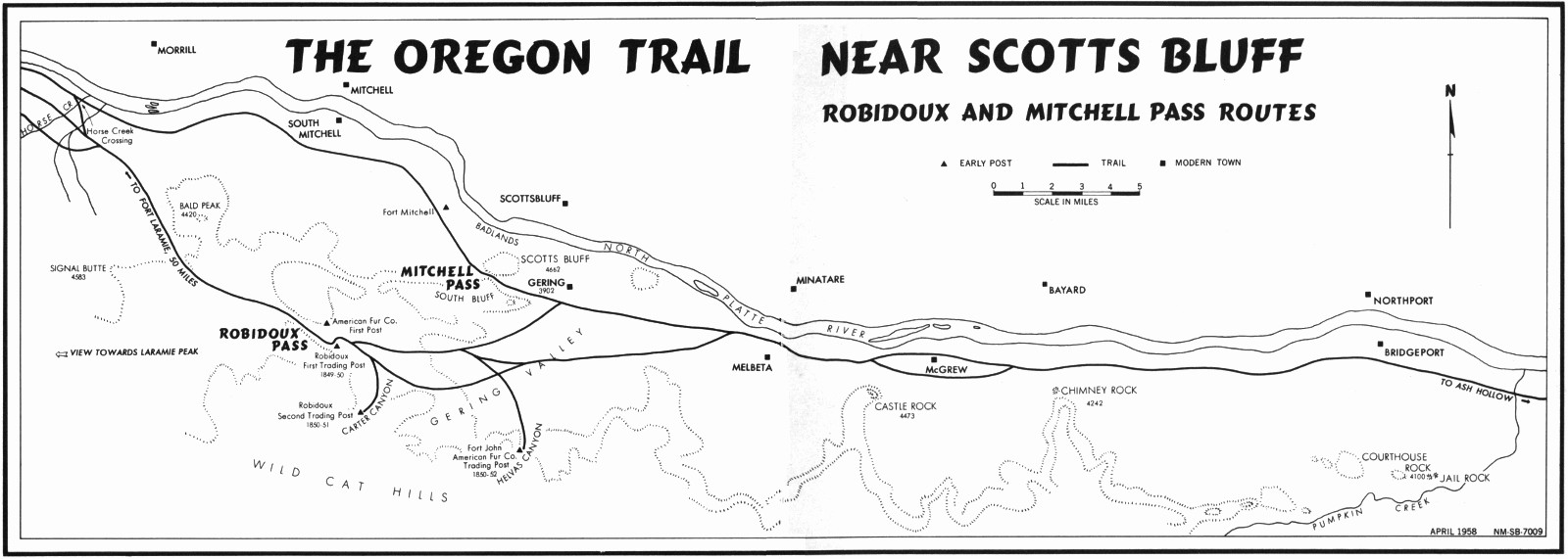 Present Scotts Bluff is but a part of the historic “Scott’s Bluffs” named for Hiram Scott, an employee of the Rocky Mountain Fur Company, whose skeleton was found in the vicinity in 1829. The first known published reference is to be found in The Adventures of Captain Bonneville, by Washington Irving, published in 1837. The first map to show this landmark is in Robert Greenhow’s Memoir, Historical and Political on the Northwest Coast of North America, published in 1840. It appeared next in the Fremont map of 1843, which became basic for later emigrant guides.