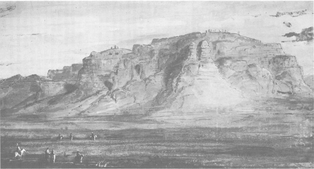 The earliest known sketch of Scotts Bluff, drawn by Alfred J. Miller in 1837. Original in Walters Art Gallery, Baltimore.