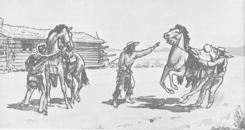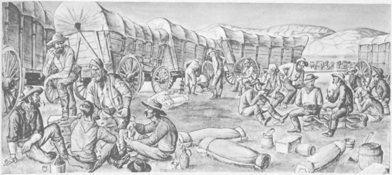 Annual rendezvous of Rocky Mountain trappers. Original sketch in Oregon Trail Museum.