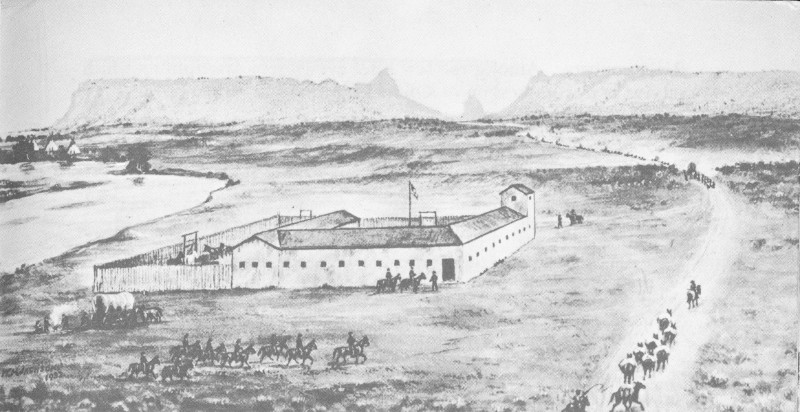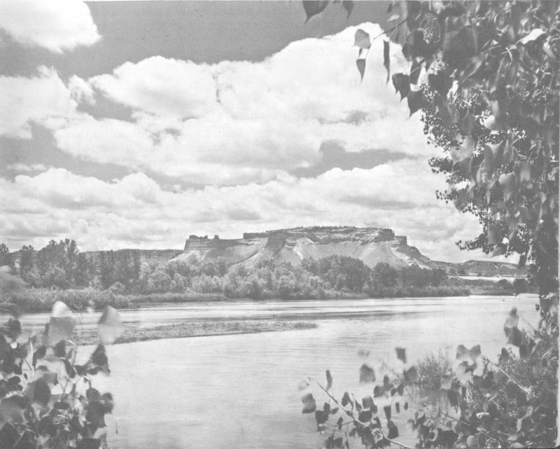 In the summer of 1826 the first of the colorful traders’ caravans, led by Ashley, Sublette, and Smith, and probably including young Hiram Scott, passed the yet unnamed bluff en route to the first big rendezvous, on the shores of the Great Salt Lake in Utah. The swarthy, colorfully garbed trappers escorted 300 pack-laden mules on this trip. At Salt Lake there were two notable events. Ashley, who had now become comfortably rich from skimming the cream of the beaver trade, sold his interests to a partnership which became known as the Rocky Mountain Fur Company, and Smith embarked on the first of his notable expeditions across the Great Basin to California, becoming the first American to reach that Mexican province by this route.