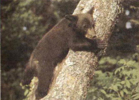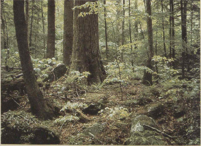 Around a bend the stream gradient steepens and so does the road. We are still in young forest; here it grows where cattle formerly grazed or lumbermen felled its giant ancestors. For some time we labor upwards, the road becoming a trail and a few big trees appearing along the tumbling creek. Then, rather suddenly, there is a striking difference in the environment. We have crossed the line into primeval forest, into territory where the axman has not been and most of the trees are big. This is Great Smokies virgin cove forest, a type unrivaled in the northern hemisphere for combined variety and size of trees. Here it is cool, shady, and moist. The tree trunks shoot high above into the canopy, which intercepts most 26 of the sunlight and seems to enclose us in a private world. The ground around us is covered with the greenery of small plants. We hear bird songs but cannot see the singers.