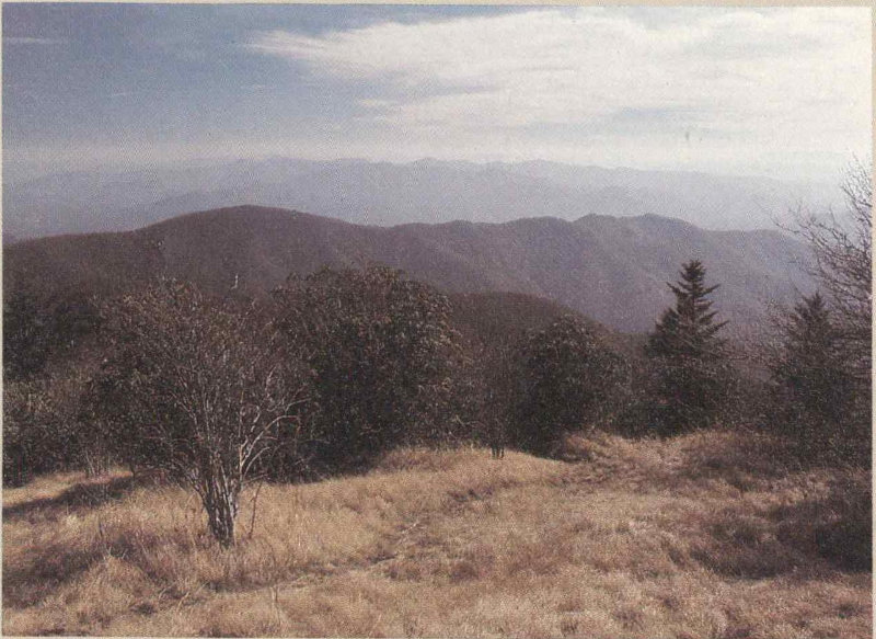 But before we make the final ascent, let’s take a short detour to a nearby knob, which promises a spectacular view, a welcome visual release after being shut in so long by foliage. Going up the side of the knob, we quickly leave the forest and begin tunneling through dense thickets of rhododendron and mountain-laurel. Trees don’t grow here at all. On top, the shrubs become smaller and we can look out over them. Perched on the end of a spur from the side of a giant valley, we look up to high ridges on both sides and down to a stream far below. Is it our imagination, or do we really hear that stream whispering to us of the humid, secret world way down there under the big trees? For many minutes we are lost in contemplation of the Smokies’ green-blue spaces.