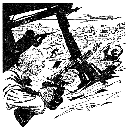 Three months later, an enemy jet came out of the sky and over the valley. A scoop arrangement under its belly was sniffing Tennessee and Alabama air for radioactive particles. It sniffed low over the town, and then again—a ruined town might hide an underground lab and converter—and then it barrel-rolled and crashed. Nine rifle bullets had hit the motor; straight back through the jet intake, into the blades.