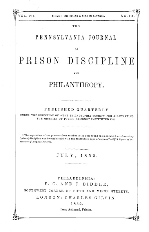 ☞ Communications and orders for this work, may be addressed “Editor of the Journal of Prison Discipline,” care of the publishers, No. 6, South Fifth Street, Philadelphia.